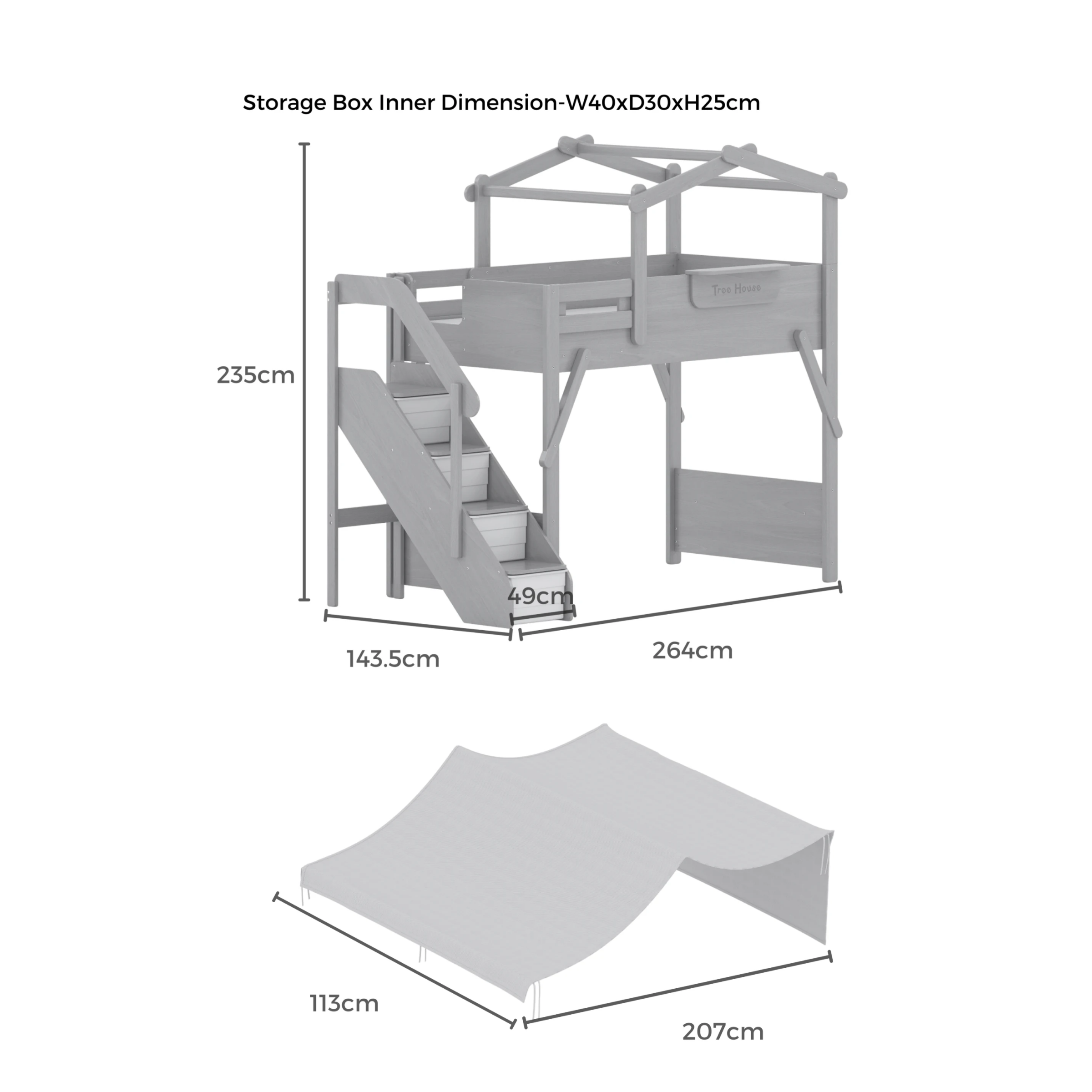 Boori Treehouse Kids NZ King Single Loft Bed + Roof Frame and Storage Staircase with Tent Canopy, Blueberry